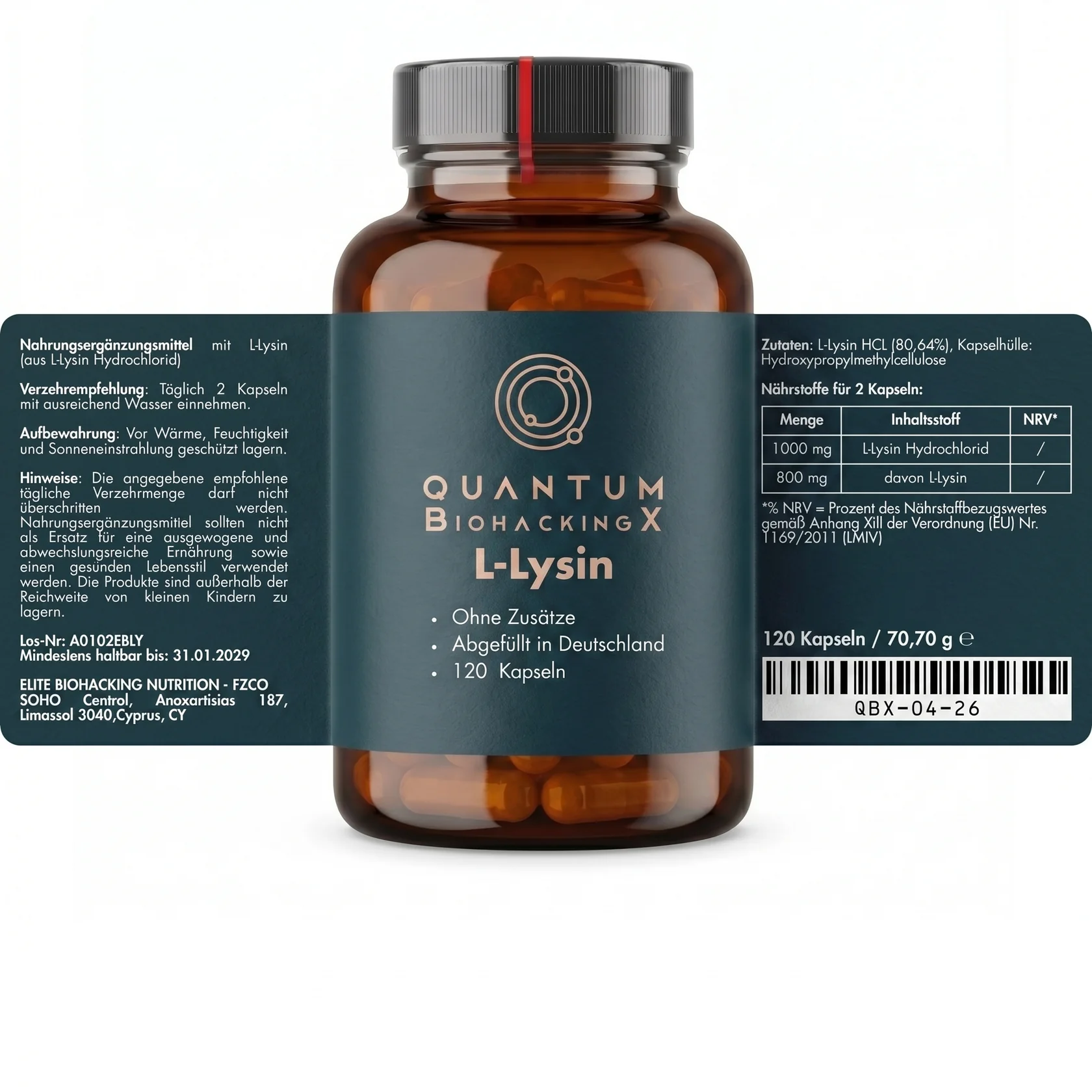 QBX L-Lysin (1.000mg) – Ohne Zusätze – 120 Kapseln